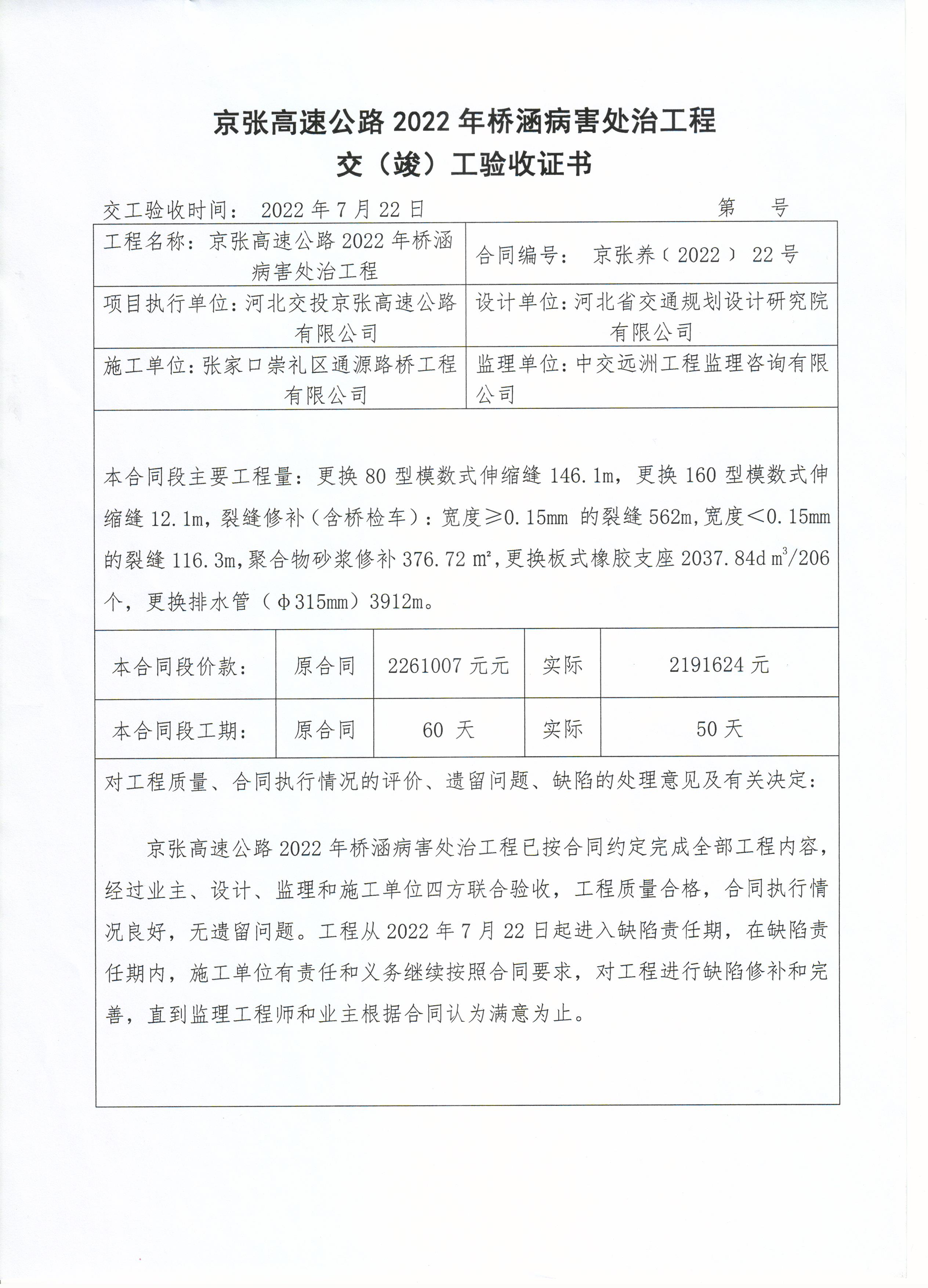 京張高速2022年橋涵病害處治工程竣工驗收