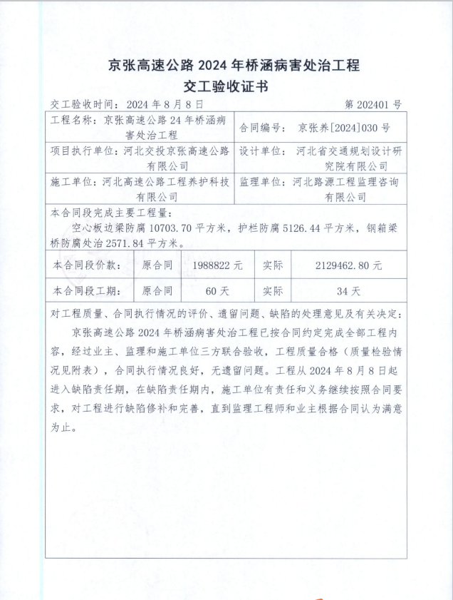 京張高速公路2024年橋涵病害處治工程交工驗(yàn)收證書(shū)